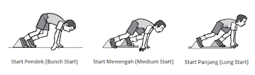 Pada start pendek pelari atau sprinter memulai start dengan posisi sejajar, sedangkan pada pada start menengah pelari agak merenggang, sedangkan pada start panjang posisinya lebih berjauhan lagi. Untuk lebih mengetahui posisi ketiga macam start tersebut pada lintasan lari jarak pendek, perhatikan gambar diatas.